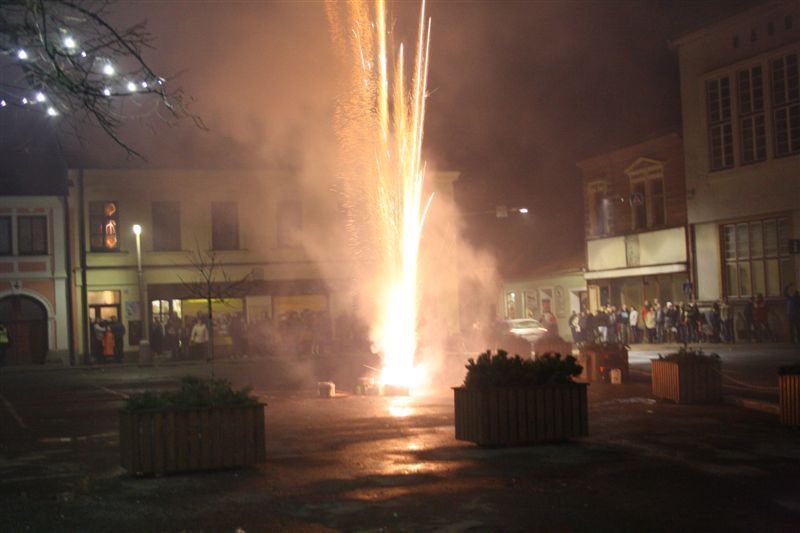 Starosta Jaroslav Soukup poté pozdravil obyvatele shromážděné na jaroměřickém náměstí a dal pokyn ohněstrůjci z Přerova, Pavlu Novákovi, aby zahájil ohňovou šou složenou z petard, světlic, rachejtlí, které se rozsvěcovaly na potemnělé obloze nad Jaroměřicemi a doplňovala je hudba z reproduktoru.