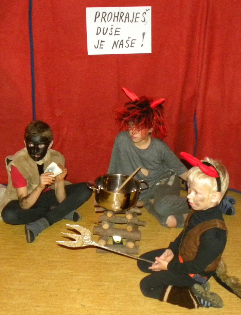 Z obyčejných žáků i učitelů se stali pohádkové postavy vodníků, víl, čertů, přišla babka kořenářka s rozličným kořením, čarodějky čarovaly ve třídě, v šatnách měl dnes svojí katovnu Mistr kat, po schodech se procházel Černý muž, ve školní družině byli upíři.