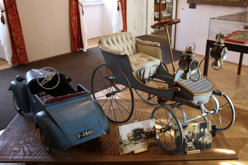 První automobil v širokém okolí vlastnila rodina Chorinských z Ledské, kteří sídlili na Sádku. Brzy nato si pořídila auto také hrabata z Vrbna, majitelé jaroměřického zámku od konce 19. století. Automobilismu se spolu s manželem věnovala například hraběnka Elvíra, původem bavorská princezna. Návštěvníci si mohou na výstavě prohlédnout její řidičský průkaz nebo účtenky od benzínu.