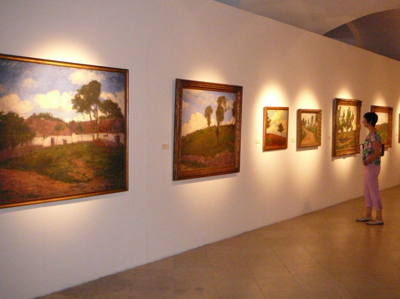 Nad výstavním sálem v poschodí jsou vystaveny kulisy, které vytvořil Antonín Slavíček pro ochotníky v Kameničkách.