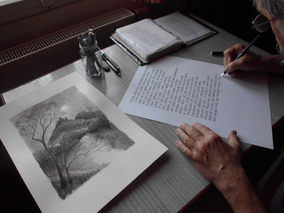 Malíř Ivan Svatoš nejznámější českou báseň přepsal ručně kaligrafickým perem, setkat se s ním mohou zájemci v Minigalerii ve Třech Studních.