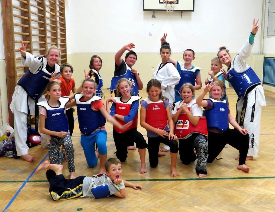 Mladí taekwondisté na společné fotografii se svými trenéry, archiv Taneční a pohybové školy kamdance