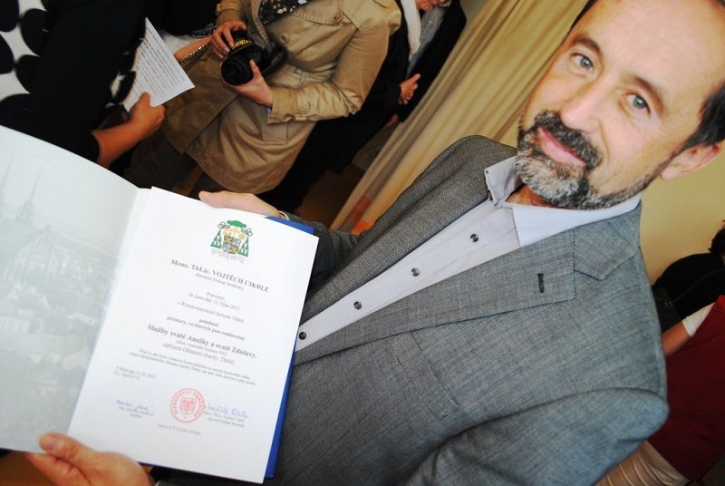 Ředitel Oblastní charity Třebíč Petr Jašek s certifikátem o požehnaných prostorách nové budovy, foto: Petr Palovčík