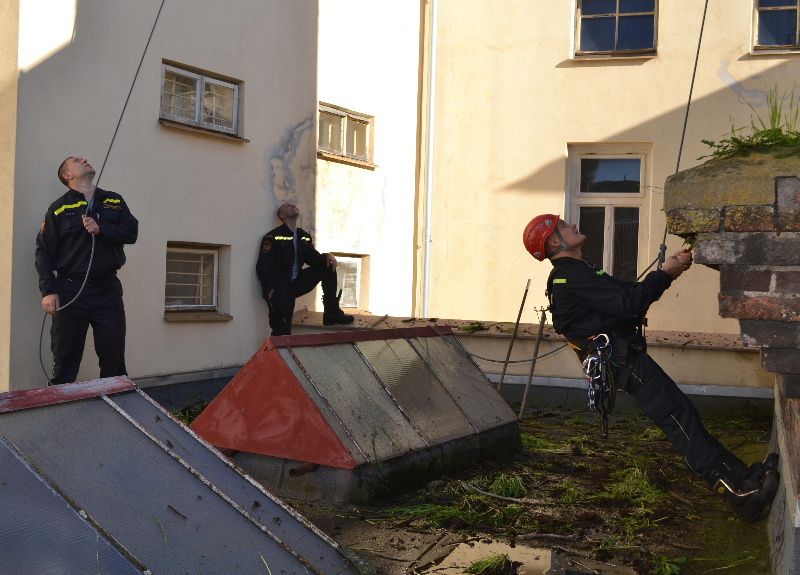 Třebíčští hasiči odstraňovali z hnízda na komíně v areálu bývalého Hassa nedaleko Karlova náměstí trsy trávy, které by na jaře bránily čápům v zahnízdění.
