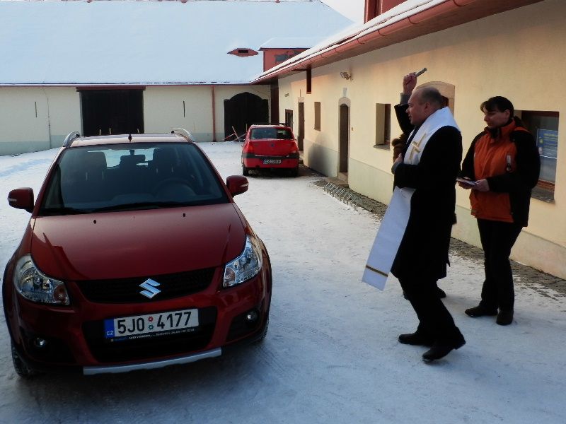 Novému automobilu udělil požehnání přibyslavský kněz P. Zdeněk Kubeš. Charitní ošetřovatelská služba v Přibyslavi nyní pečuje o zhruba