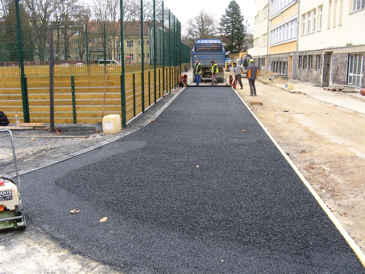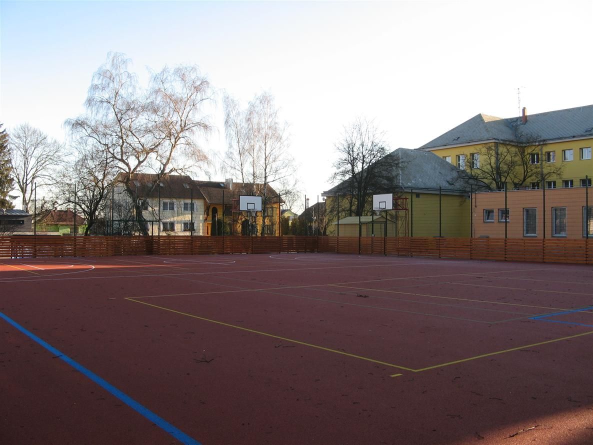 „Původní převážně asfaltová školní hřiště byla nahrazena víceúčelovým hřištěm s umělou trávou a basketbalovým hřištěm s polyuretanovým povrchem. Kolem těchto oplocených hřišť vznikl běžecký ovál s umělým povrchem.