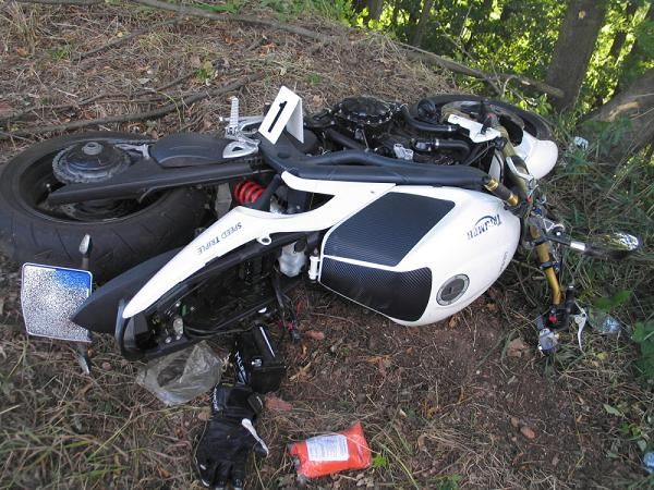 „Dvaatřicetiletý muž na motocyklu Triumph při projíždění pravotočivé zatáčky přejel vlevo mimo silnici, kde s motocyklem upadl na pravý bok a následně narazil do betonové mostní konstrukce.
