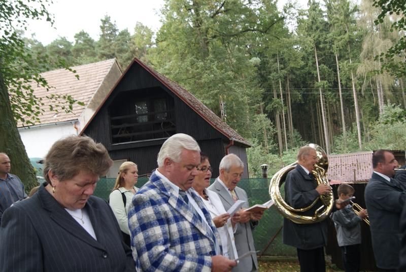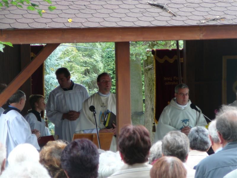 O jedenácté hodině se konala mše, kterou letos sloužil brněnský spirituál Pavel Konzul spolu s P. Františkem Puchnarem a velkoújezdským farářem Martinem Gronesem. Odhadem asi pětistovka poutníků, sedících i stojících, se po zachmuřené obloze dočkala kolem poledne i krásného slunečného počasí.
