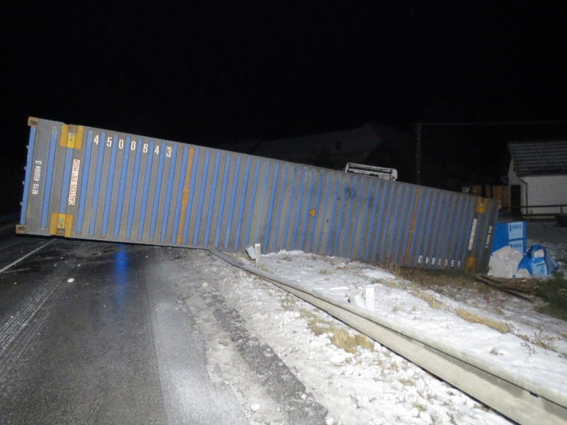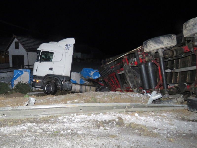 Při průjezdu obcí nepřizpůsobil rychlost jízdy povětrnostním podmínkám a na namrzlém povrchu dostal se soupravou smyk.