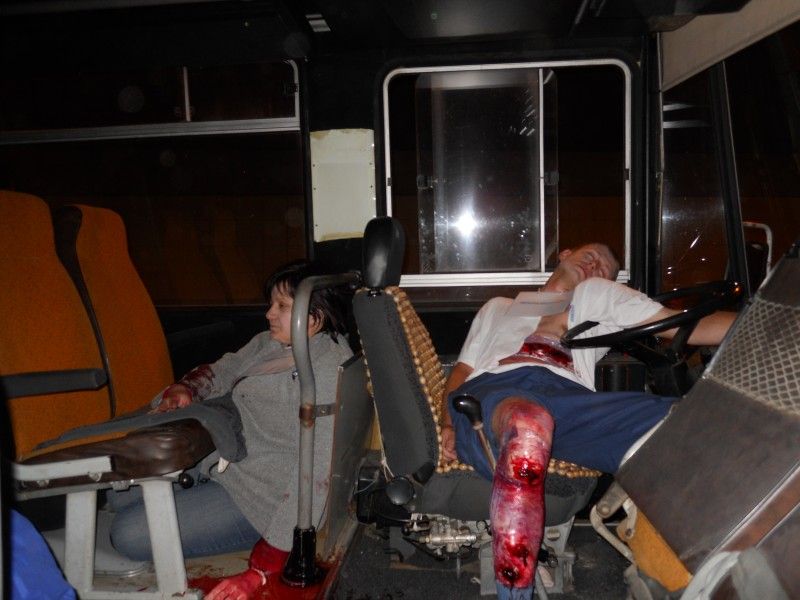 304 metrů, přibližně uprostřed na pravé krajnici stojí "nabouraný" autobus, za ním nákladní auto. Autobus má v přední části zapasovaný vrak osobního automobilu položený na pravém boku. Figuranti z řad cestujících jsou už na svých místech. Těsně po půl deváté vypuká akce. Cestující křičí a buší do oken autobusu, přijíždí první zásahové vozidlo hasičů, v těsném sledu druhé. Hasiči rozbíjí zadní sklo u osobního auta a vyprošťují řidiče. Stejný osud čeká boční sklo autobusu, sprcha skleněných střepů padá na asfalt. Přicházejí na řadu vyprošťovací nůžky a hasiči vystříhávají a vyřezávají otvor do boku autobusu. Pak postupně vynášejí zraněné a ukládají je na shromaždiště nedaleko autobusu.