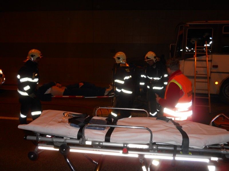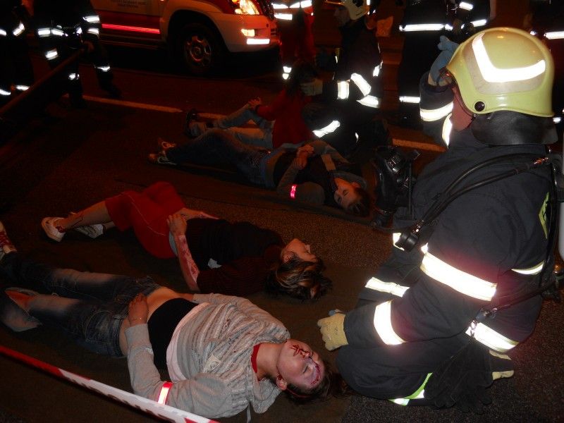 I v simulovaných podmínkách však namaskovaná zranění na mě působí místy dost věrohodně. Podle scénáře si dopravní nehoda vyžádala dva lidské životy a dalších 28 osob utrpělo různě závažná poranění. Při srážce měly uniknout pohonné hmoty nejen na komunikaci, ale také do kanalizace a řeky Jihlavy. Ve chvíli, kdy my se nacházíme v tunelu, na řece Jihlavě hasiči spouští norné stěny. Od tiskové mluvčí Hasičského záchranného sboru Kraje Vysočina Petry Musilové se dovídám, že zhodnocení akce, dojezdových časů apod. bude k dispozici až za pár dní. Hasiče teď čeká úklid vraků a vozovky a já vycházím před tunel. Už je úplná tma, zhruba tři čtvrtě na deset. V tuto chvíli zde ještě operuje zdravotnická záchranná služba. Mezi "zraněnými" na asfaltu leží i