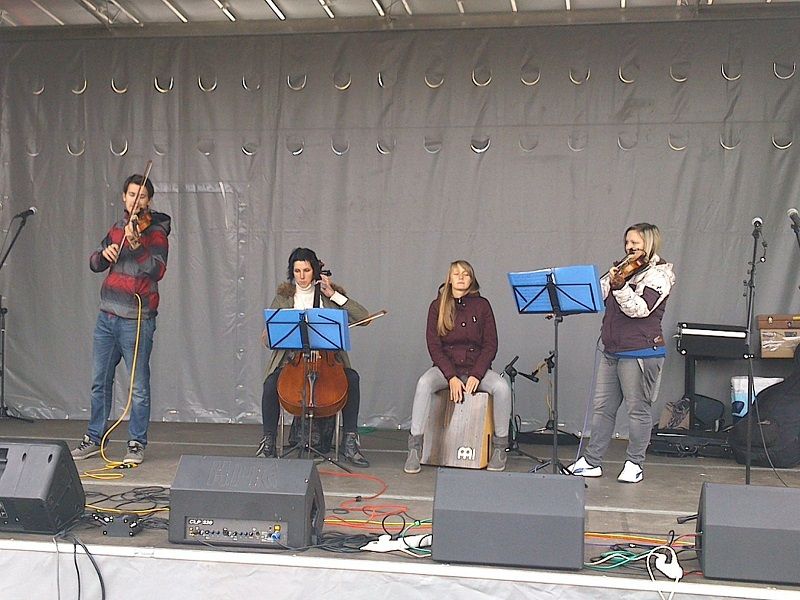 Electroshock. Skupina mladých umělců z Prahy, kteří hrají vlastní aranže populárních skladeb. Začali skladbou Viva la vida od skupiny Coldplay. Tím Electroshock nasadili dost vysokou laťku svého koncertu. Od této chvíle hráli jeden hit za druhým. Mě dostali nezapomenutelnou skladbou z roku 1972 Smoke on the water od Deep Purple. Electroshock své vystoupení zopakovali ještě předpolednem.