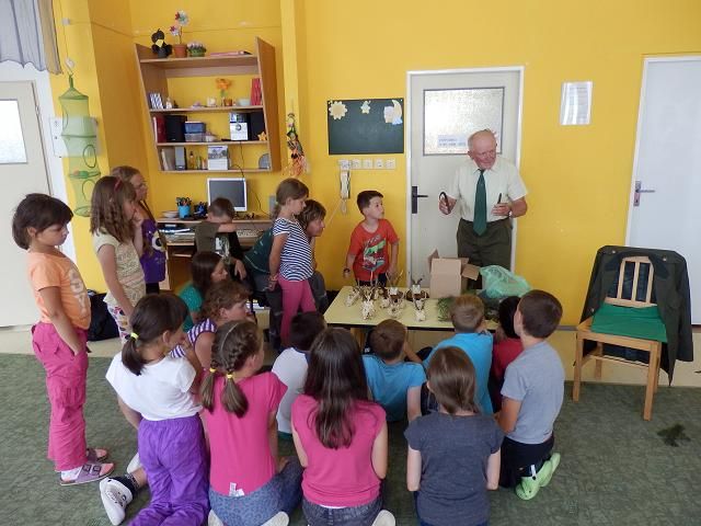 Z Centra postupně vyšly tři skupiny, které se řídily šipkami a plnily jednotlivé úkoly (např. určit stáří pařezu, najít a určit bylinku v okolí, určit vedlejší strom…). Když skupina došla do lesa, měla za úkol najít lišku. Po jejím objevení liška pro ně měla úkol (poznat z obrázků ptáky, větvičky stromů či stopy zvířat). Všechny skupiny zdárně dorazily do lesa a našly všechny lišky. Po obědě za dětmi přišel František Kratochvíl, který se 40 let věnoval myslivosti a pověděl dětem o přírodě – druzích stromů a ptáků v lese. Přinesl větvičky stromů, dobové fotografii a také parůžky ze zvířat, které děti zajímaly nejvíce.