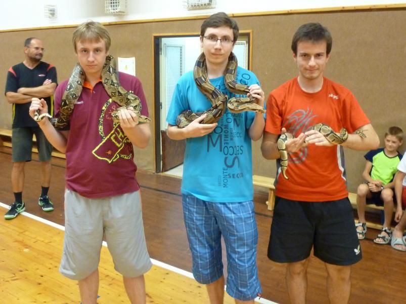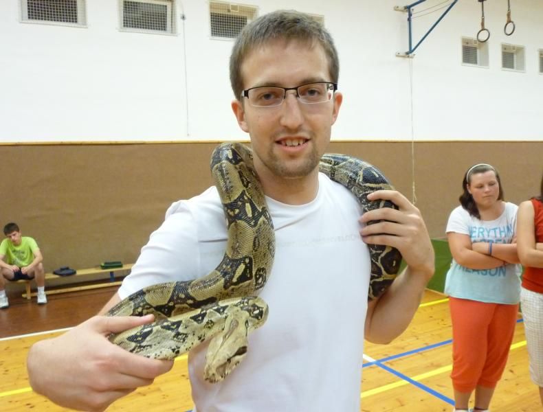 Od kdy se konají kempy v Hrotovicích? Asi od roku 2001, jen s jedinou přestávkou v roce 2006, kdy se hrotovická škola rekonstruovala. Za tu dobu jsme stihli spoustu doprovodných akcí - pořádali jsme výlety do okolí, chodili na koupaliště, byli jsme i v informačním centru jaderné elektrárny v Dukovanech. Letos jsme tu měli návštěvu místní šermířské skupiny a především focení s hady vyvolalo mezi účastníky velký zájem, hodně smíchu i trochu paniky a zděšení.