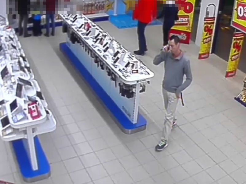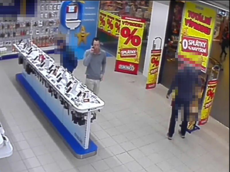 „Muž nejprve obcházel kolem pultu s mobilními telefony, které jsou k němu připevněny a zajištěny proti krádeži. Muž jeden z vystavených telefonů vzal a po nějaké době se mu podařilo mobilní telefon odpojit a uvolnit. Telefon položil zpět na pult a vyčkával na vhodný okamžik, protože se v obchodě v tu dobu pohybovali další nakupující.