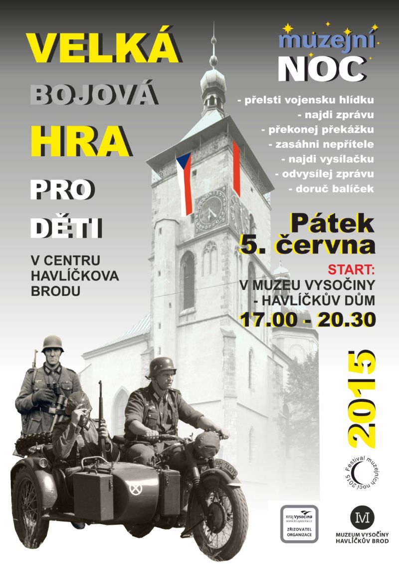 Muzeum si letos připomíná 70. výročí konce druhé světové války, které připomíná nejen aktuální výstava 2. světová válka na Havlíčkobrodsku, ale na toto téma bude zaměřen i historický a fotografický kvíz a Velká bojová hra pro děti i dospělé. Děti obdrží historickou legitimaci, mapu centra města a budou plnit nejrůznější úkoly. Cílem bude doručit zprávu balíček s náboji odbojářům, přitom se vyhnout se německým ozbrojeným hlídkám, pomocí minohledačky najít zprávu v minovém poli, překonat terénní překážky či odvysílat zprávu vysílačkou. Ve večerních hodinách bude promítání velmi zajímavého filmu o partyzánské skupině Mistr Jan Hus, na motivy knihy Partyzánská odysea a osud Věry Pilařové a beseda s pamětníky. Začátek je od 17.00.