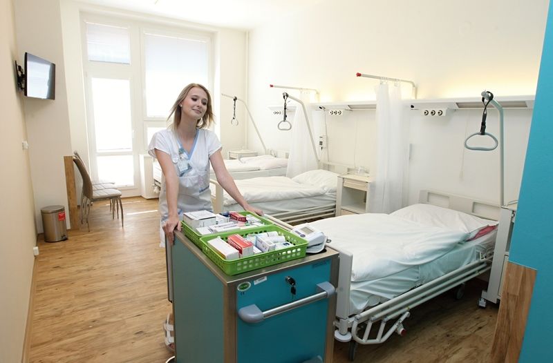 Vánoční pokoj je laděný do modro-béžové barvy a kompletní rekonstrukcí prošla také koupelna. „Nyní je bezbariérová, takže tam může pohodlně také pacient na vozíku, což pro nás bylo velice důležité,“ doplňuje vrchní sestra Anna Kabátková. Na oddělení jsou hospitalizování pacienti, kteří jsou často o berlích, nebo celkově špatně pohybliví po úrazu či nehodě.