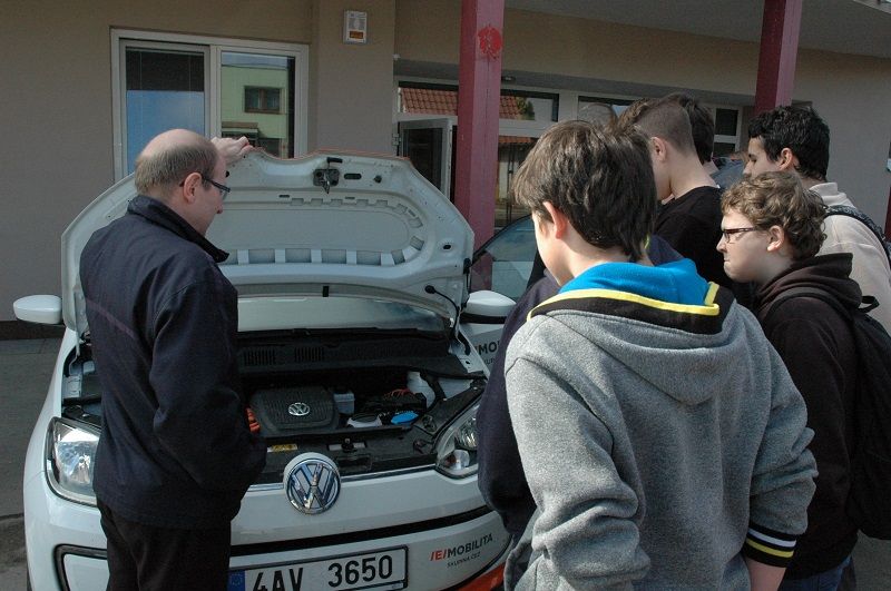 Žáci ZŠ ve Velké Bíteši si nechávají vyložit, jak funguje elektromobil. Jiří Gerža vlevo.