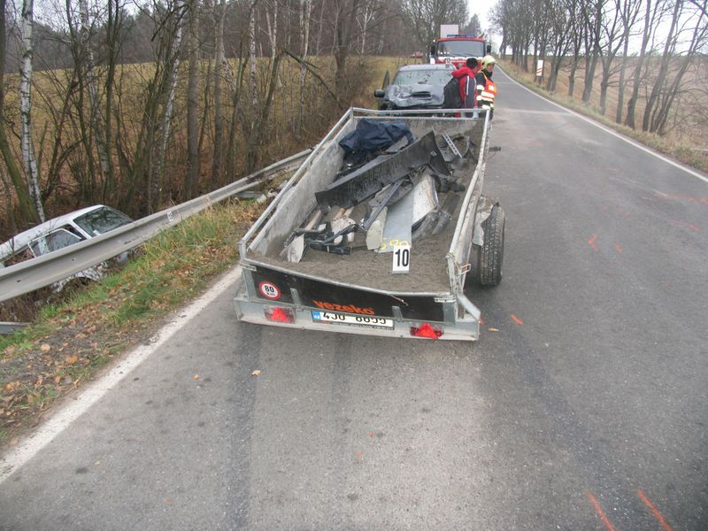 Dvě lehká zranění řidičů si vyžádala dopravní nehoda před osmou hodinou ranní na silnici mezi Rozsochatcem a Chotěboří. „Řidič nákladního vozu Mazda s přívěsem naloženým betonem jel ve směru od Rozsochatce, po projetí levotočivé zatáčky v klesání nepřizpůsobil rychlost jízdy svým schopnostem a došlo k rozkývání přívěsu. Řidič s vozem najel na pravou krajnici, narazil do svodidla, od kterého se auto odrazilo a vjelo zpět na silnici. Řidič dostal smyk, přejel do protisměru, kde se srazil s projíždějícím vozem Toyota. Nárazem se přívěs odpojil a poškodil levou stranu toyoty. Řidič mazdy po střetu pokračoval dál v jízdě, prorazil svodidla, s vozidlem se přetočil a zajel mezi vzrostlé stromy. Řidiči obou vozidel byli s lehčími zraněními převezeni do nemocnice, odkud byli po ošetření propuštěni,“ popsala ranní havárii Jana Mazourová, tisková mluvčí Policie ČR v Havlíčkově Brodě. Na vozidlech, nákladu a svodidlech vznikla škoda ve výši 260 000 Kč. Alkohol u řidičů vyloučili policisté na místě dechovou zkouškou.