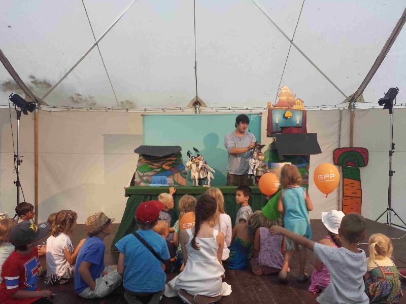 V parku zámku se odehrálo několik divadel pod bílým stanem – Honzík Hrubec a jeho Dřevěné divadlo
