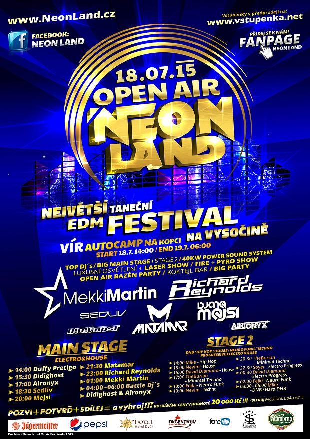 Velký taneční open air festival Neon Land Music Festival 2015 se koná v sobotu 18. a v neděli 19. července v autocampu na kopci Vír.