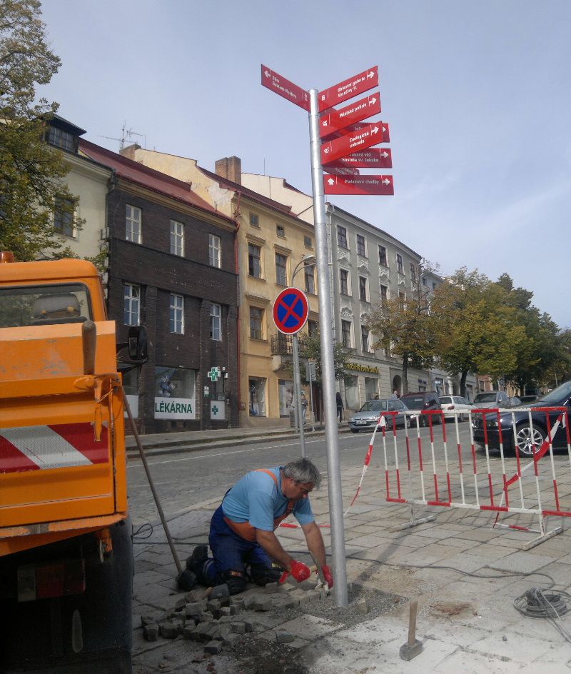 Na šestnácti místech jsou na sloupcích výrazné červené smaltované tabulky ukazující směr k významným cílům jako je například populární jihlavské podzemí, zoologická zahrada, pošta nebo nádraží.