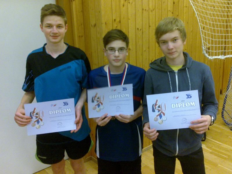 Výsledky třetího turnaje dorostu v pondělí 17. listopadu v Želetavě: 1. Daniel Bárta (Jiskra Havlíčkův Brod) 2. Aleš Novák (Jiskra Havlíčkův Brod) 3. Tomáš Trnka (Jiskra Humpolec) 4. Šárka Pikolonová (Sokol Brtnice) 5. Vít Brukner (Jiskra Humpolec) 6. Dominik Lengal (SK Jihlava) 7. Jan Pazdera (Jiskra Havlíčkův Brod) 8. Petr Kmoch (Jiskra Humpolec) Čtyřhra: 1. Daniel Bárta - Aleš Novák (oba Jiskra Havlíčkův Brod) 2. Šárka Pikolonová (Sokol Brtnice) - Dominik Lengal (SK Jihlava) 3.-4. Vojtěch Samek - Lukáš Vavřík (oba TJ Žďár nad Sázavou) 3.-4. Martin Jirásek - Jan Pazdera (oba Jiskra Havlíčkův Brod) Útěcha: 1. Martin Švihálek (TJ Mikulovice) 2. Martin Jirásek (Jiskra Havlíčkův Brod) 3. Jan Macháč (SKST Třešť) 4. Petr Navrkal (TJ Mikulovice) Výsledky čtvrtého turnaje mladšího žactva v pondělí 17. listopadu v Humpolci: 1. Šimon Jadrný (SK Jihlava) 2. Štěpán Sukup (TJ Žďár nad Sázavou) 3. Erik Topič (Jiskra Humpolec) 4. Martin Karel (SB Světlá nad Sázavou) 5. Jaroslav Hájek (Jiskra Humpolec) 6. Jan Stöhr (Slavoj ‚Polná) 7. Matěj Vrzal (Sokol Brtnice) 8. Matěj Holub (SK Jihlava) Čtyřhra: 1. Šimon Jadrný (SK Jihlava) - Štěpán Sukup (TJ Žďár nad Sázavou) 2. Martin Karel (SB Světlá nad Sázavou) - Jan Jírek (TJ Žďár nad Sázavou) 3.-4. František Och - Patrik Pazderka (oba Jiskra Humpolec) 3.-4. Erik Topič - Jaroslav Hájek (oba Jiskra Humpolec) Útěcha: 1. Tomáš Svoboda (Spartak Velká Bíteš) 2. Lucie Janáčková (TJ Žďár nad Sázavou) 3.-4. Petr Hájek (SB Světlá nad Sázavou) 3.-4. Matěj Pátek (Jiskra Humpolec) Na titulní fotografii vítězné trio z turnaje dorostu v Želetavě - zleva Trnka, Bárta a Novák (foto: Jiří Palát)Autor: Martin Pluhař