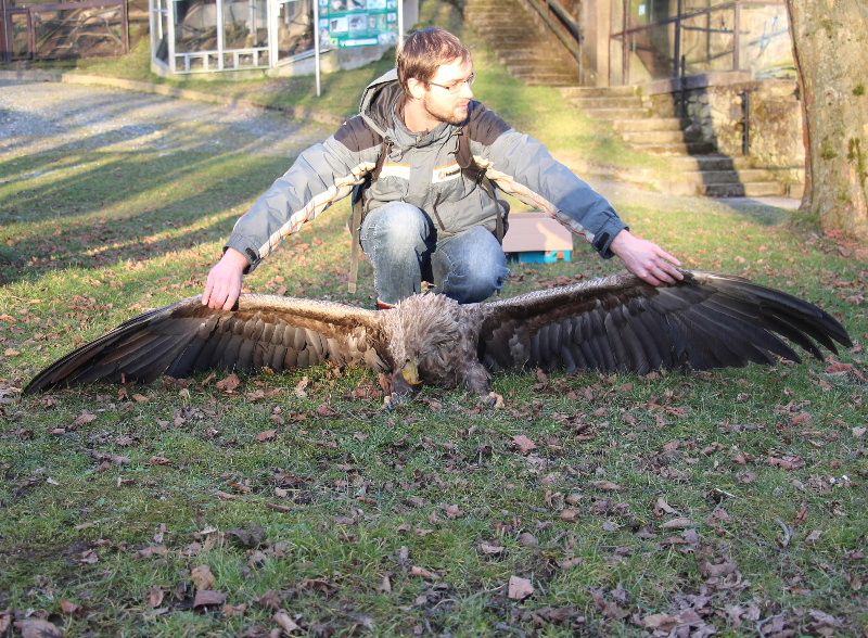 „Po příjezdu na místo, jsme nalezli dospělou samici orla mořského, která se chovala velmi apaticky, neměla snahu se bránit a bylo viditelné plné vole masa.