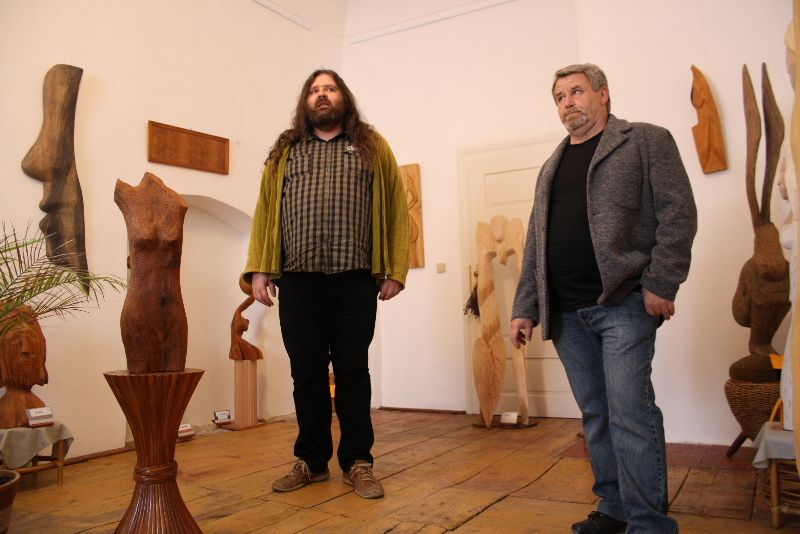 V 17.00 byla současně zahájena slavnostním přípitkem a úvodním slovem autora výstava dřevořezeb (Lidstvo, Stín, Anděl s křídly od zlata…) jaroměřického umělce