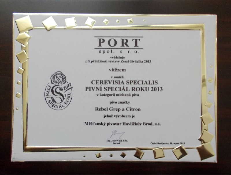 Ocenění vítězného speciálu Rebel Grap a Citron, archiv Měšťanského pivovaru Havlíčkův Brod, a. s.