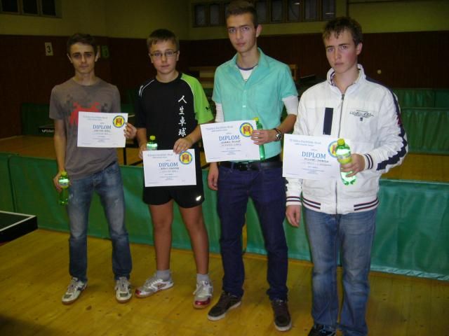 Výsledky turnaje dorostu v Havlíčkově Brodě: 1. Jan Pluhař (TJ Žďár nad Sázavou) 2. Daniel Bárta (Jiskra Havlíčkův Brod) 3. Tomáš Bártík (Jiskra Havlíčkův Brod) 4. Aleš Svoboda (Sokol Moravské Budějovice) 5. Šárka Pikolonová (Sokol Brtnice) 6. Marek Čermák (SK Telč) 7. Aleš Novák (Jiskra Havlíčkův Brod) 8. Šimon Jadrný (SK Jihlava) Soutěž útěchy: 1. Vít Brukner (Jiskra Humpolec) 2. Tomáš Trnka (Jiskra Humpolec) 3. Jan Malina (Jiskra Havlíčkův Brod) 4. Jan Kabelka (Sokol Jemnice) Čtyřhry: 1. Jan Pluhař (TJ Žďár nad Sázavou) - Aleš Svoboda (Sokol Moravské Budějovice) 2. Tomáš Trnka - Vít Brukner (oba Jiskra Humpolec) 3.-4. Daniel Bárta - Vilém Krejcar (oba Jiskra Havlíčkův Brod) 3.-4. Tomáš Bártík - Aleš Novák (oba Jiskra Havlíčkův Brod) Na titulní fotografii medailisté dvouher staršího žactva, zleva Bárta, Pluhař a Bártík Spolupráce a fotografie: Pavel StejskalAutor: Martin Pluhař