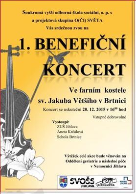 Projektová skupina O(či) Světa při Soukromé vyšší odborné škole sociální, o. p. s., Jihlava pořádá v neděli 20. prosince v Brtnici benefiční koncert.