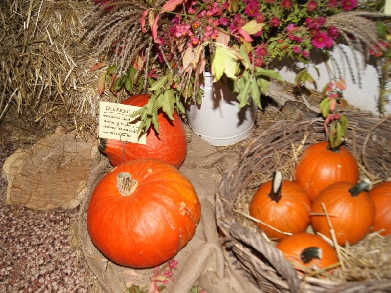 A že je skutečně na co se dívat! Dýně nejrůznějších tvarů – kulaté, úzké, podlouhlé, bachraté, tak zvané kačenky, dýně žluté, oranžové, zelené, bílé, žíhané, ba dokonce modré. Ať jsou však jakékoliv, všechny mají dužninu oranžovou. Celkem čtyřiadvacet odrůd, z nichž většina je na prodej.