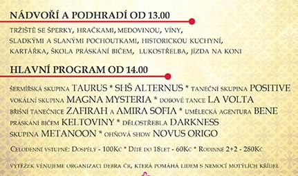 Hlavní program začíná ve 14.00, vystoupí šermířské, divadelní a taneční skupiny, zazní dobová hudba
