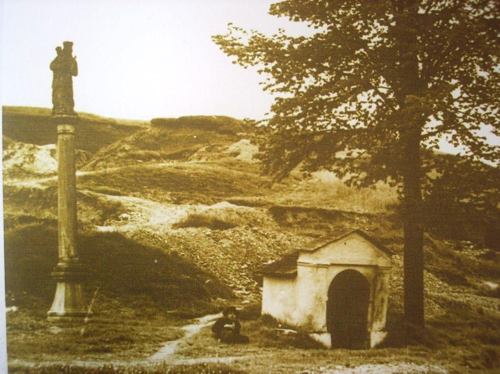 Panny Marie držící Ježíška. Vše ve značně poničeném stavu. Podle historických fotografií stála vedle studánky. Ač byla socha už asi šedesát let povalena a zahrabaná v zemi, stále je zapsaná v seznamu nemovitých kulturních památek ČR.