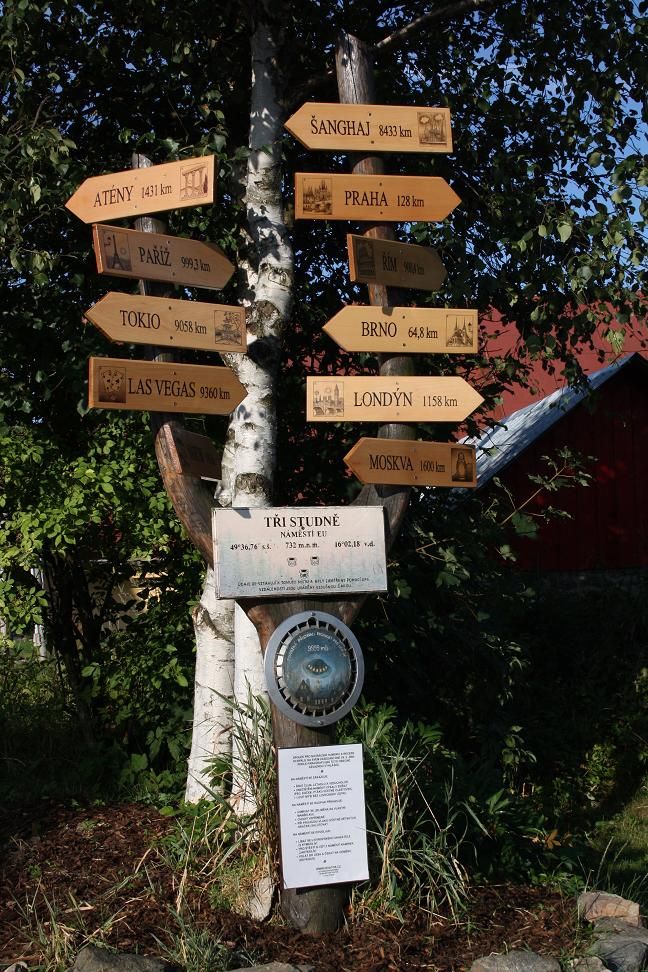 Nyní názvy velkoměst spolu s kilometráží doplňují stylizované kresby. Paříž se pyšní Eiffelovou věží, Šanghaj moderními mrakodrapy a Brno Petrovem. Co namaloval známý český vedutista k africkému Nairobi, Las Vegas, Moskvě nebo Aténám, zjistí až sami návštěvníci. Tři Studně sice už nedrží rekord s nejmenším náměstím v ČR (překonalo je prostranství v Bohumíně), ale to, že se vesnice pyšní náměstím a nikoliv návsí, jim nikdo nesebere.