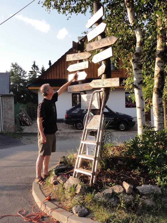 Malíř Ivan Svatoš zrekonstruoval nejfotografovanější objekt ve Třech Studních na Žďársku - rozcestník, na němž jsou udány vzdálenosti do světových metropolí.