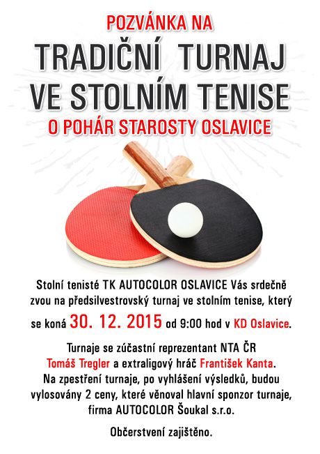 „Věřím, že účast Tomáše Treglera bude tahákem, zvlášť po jeho vítězství nad šestnáctinásobným evropským šampionem Timo Bollem před vánočními svátky v Lize mistrů. Samozřejmě přijede i František Kanta, který je naším pravidelným účastníkem. V dlouhé historii našeho turnaje jsme tak skvělou účast ještě neměli!“ láká stolní tenisty na nevšední sportovní zážitek František Šoukal, hlavní sponzor turnaje a místopředseda pořádajícího TK AUTOCOLOR Oslavice.