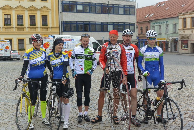 Skupinu cyklistů vede na historickém vysokém kole, známém také jako velociped, jezdec Josef Zimovčák, který je patronem celé akce.