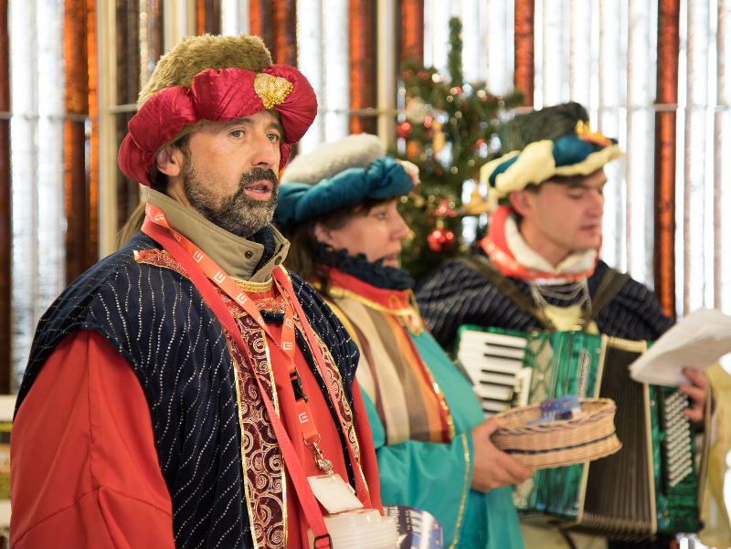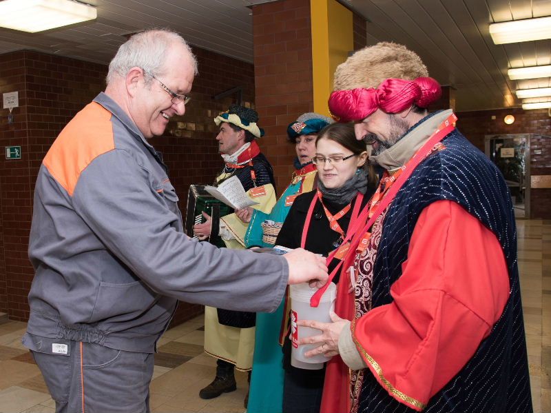 V čase oběda se zaměstnanci elektrárny potkali s koledníky v hale před jídelnou. Za zvuku harmoniky a zpěvu koled se tak mohli připojit k celostátní sbírce na pomoc potřebným. „Dobrý rok vám vinšujem a vše dobré přejem,“ srdečně a s úsměvem prozpěvovali koledníci.
