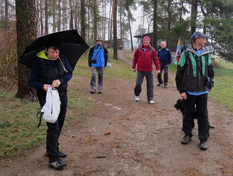 Turisté v dešti na Zrádném vrchu u Budišova