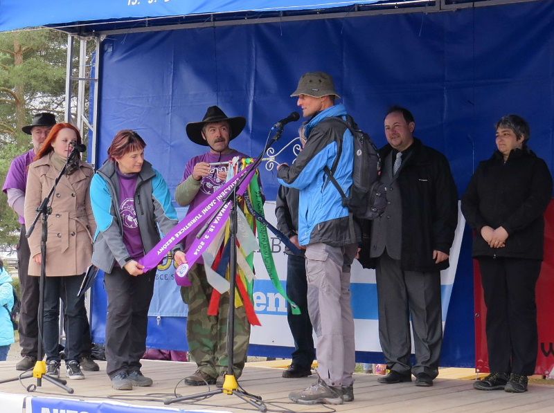Poté, co turisty přivítali starosta Trnavy Břetislav Česnek a starosta Budišova Petr Piňos, otočili za zvuků fanfáry předseda KČT Trnava František Dlabáč a organizátorka Jarka Adamová symbolickým klíčem, přidali na něj třiadvacátou pamětní stuhu a turistická sezona 2014 byla zahájena.