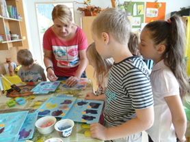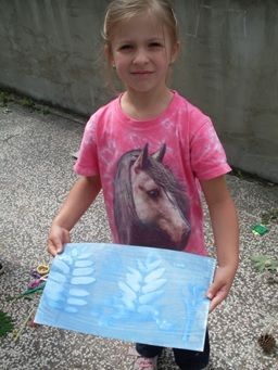 A už tu byl pátek. Hned po ránu se pustily děti do práce. Dokončit kočičky, domácí mýdla vyklopit z formy a zabalit do pytlíčku. Na terase bylo připraveno poslední tvoření. Kouzlení s papírem, který byl potřený roztokem. Na tuto stranu papíru děti pokládaly různé listy, šišky nebo květiny a nechaly vše na slunci reagovat. Po chvíli bylo vidět, jak papír tmavne a tam, kde ležely předměty, byla světlá místa. Stačilo výkres namočit do vody a stínování bylo ještě intenzívnější. Tato technika hodně připomínala, jak se dříve vyvolávaly fotografie. Po obědě si rozdaly výrobky z celého týdne, zazpívaly oblíbenou písničku, všechny děti dostaly společnou fotku na památku a pomalu se loučily. „Ne, já ještě nechci domů,“ doprovázelo loučení a objímání.