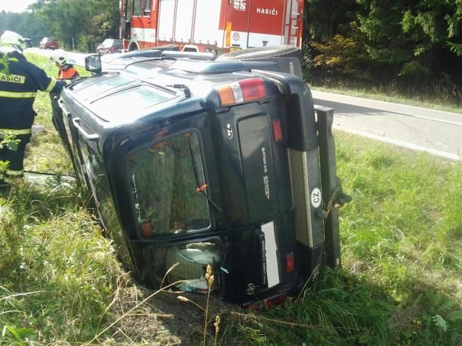 „Řidič s terénním vozem Toyota Landcruiser s obytným přívěsem skončil po nehodě převrácený v příkopu na boku. Přívěs se po nárazu odpojil, převrátil na střechu a částečně zasahoval do vozovky. Nehoda se obešla bez zranění osob.