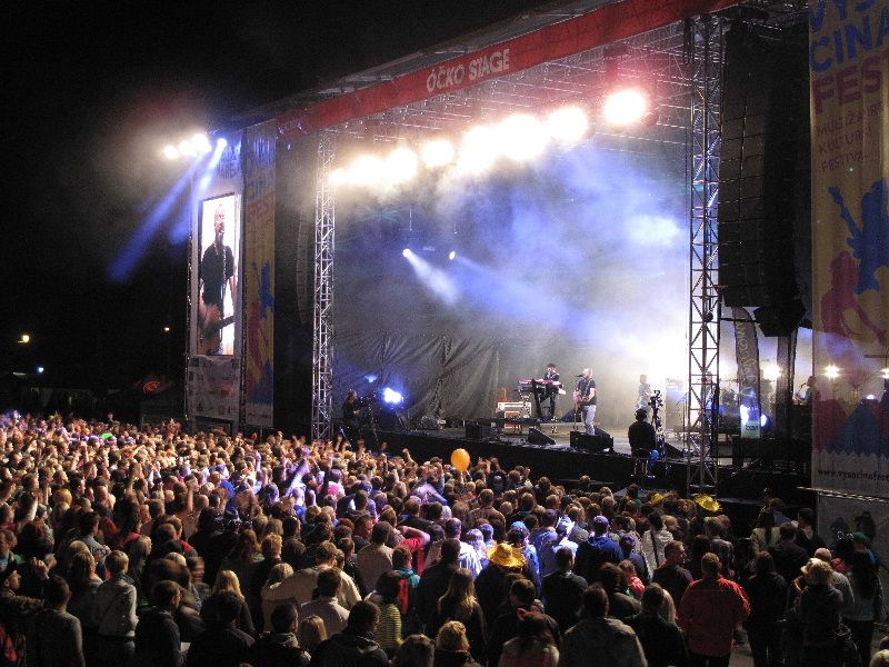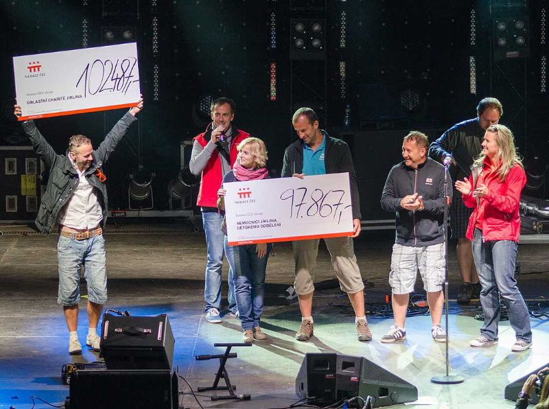 Slavnostní předání symbolických šeků na hlavním pódiu po koncertě Davida Kollera – zleva Vítězslav Schrek, zástupce ředitele Oblastní charity Jihlava; Simona Hájková, vrchní sestra dětského odd., a Martin Zimen, primář dětského oddělení jihlavské nemocnice; Petr Burián, ředitel pořádající organizace Yashica, foto: Jakub Mertl