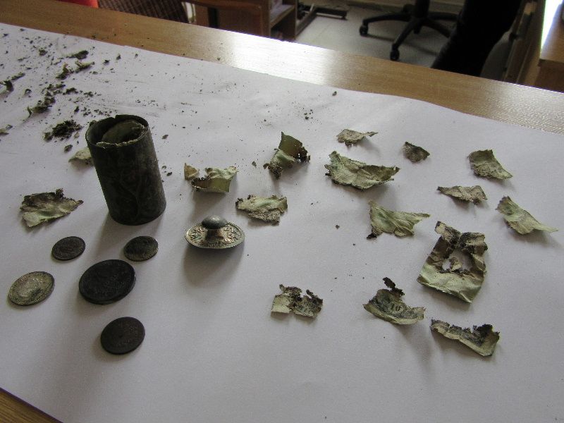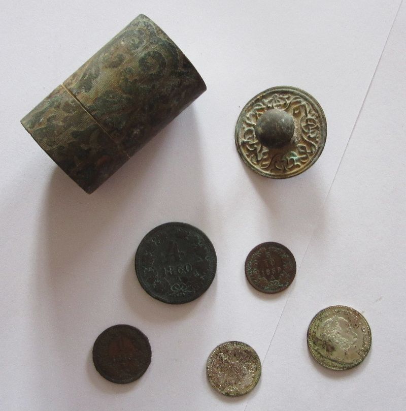 Celkem bylo ve schránce pět kovových mincí, jedná se o mince v hodnotě 4 krejcary, datum ražby 1860, 10 krejcarů, datum ražby 1869, 20 krejcarů, datum ražby 1869, 1 krejcar, datum ražby 1860 a 5/10, datum ražby 1859.