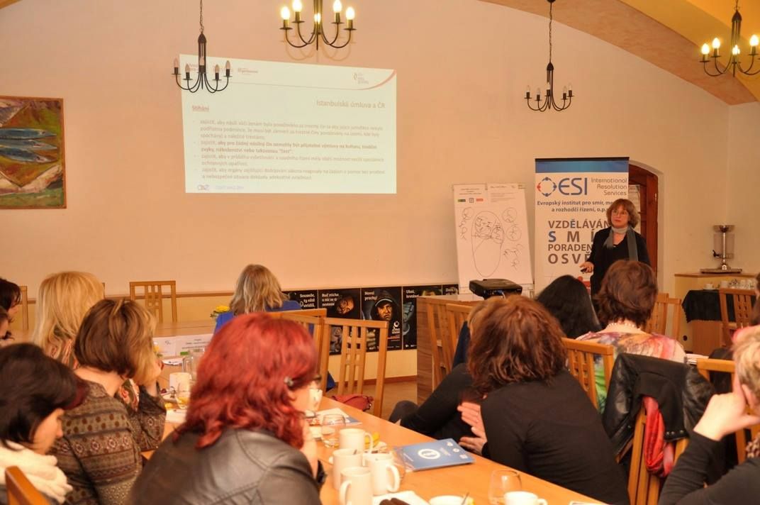 Mimořádným zážitkem byly rovněž proslovy zástupkyň Evropského institutu pro smír, mediaci a rozhodčí řízení Evy Vaňkové a Lenky Šalamoun. V této mimořádné konkurenci nezapadly příklady z praxe Bílého kruhu bezpečí Jihlava a Občanské poradny Třebíč, které přinesli Antonín Křoustek a Hana Chloupková. Anna Machátová na téměř samotný závěr shrnula výstupy projektu a hlavně alarmující fakt, že i mezi ženami, které řídí organizace nabízející sociální a prorodinné služby, je mnoho žen – obětí násilí. Konference byla zakončena praktickou ukázkou vedení terapeutických a svépomocných skupin vedených Lenkou Slovákovou.