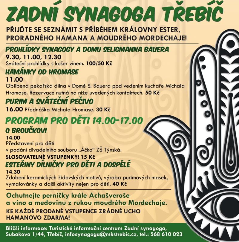 V 9.30 začíná v Zadní synagoze celodenní program, v jehož rámci čekají na děti a dospělé sváteční prohlídky Zadní synagogy s přilehlým Domem S. Bauera, pekařská dílna Hamánky od Hromase, pohádka pro děti O broučkovi, zdobení keramických židovských motivů a přednáška o Purimu.