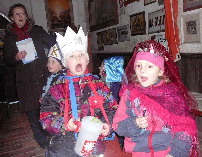 Tříkrálové koledování u vánočního stromu na Karlově náměstí. S doprovodem harmoniky se zpívaly koledy, podával se horký čaj a punč, povídalo se o Charitě a děti se vozily na dvou urostlých ponících.