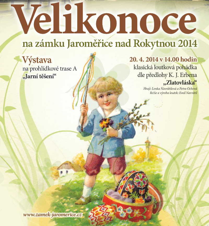 Zámek Jaroměřice nad Rokytnou chystá na Velikonoční víkend tematickou výstavu Jarní těšení, kterou vyzdobí hraběcí apartmány prohlídkové trasy A. V neděli 20. dubna je navíc pro děti připravena klasická loutková pohádka na motivy K. J. Erbena Zlatovláska. Pohádka se odehraje na konci prohlídkové trasy v Sala terreně od 14.00.